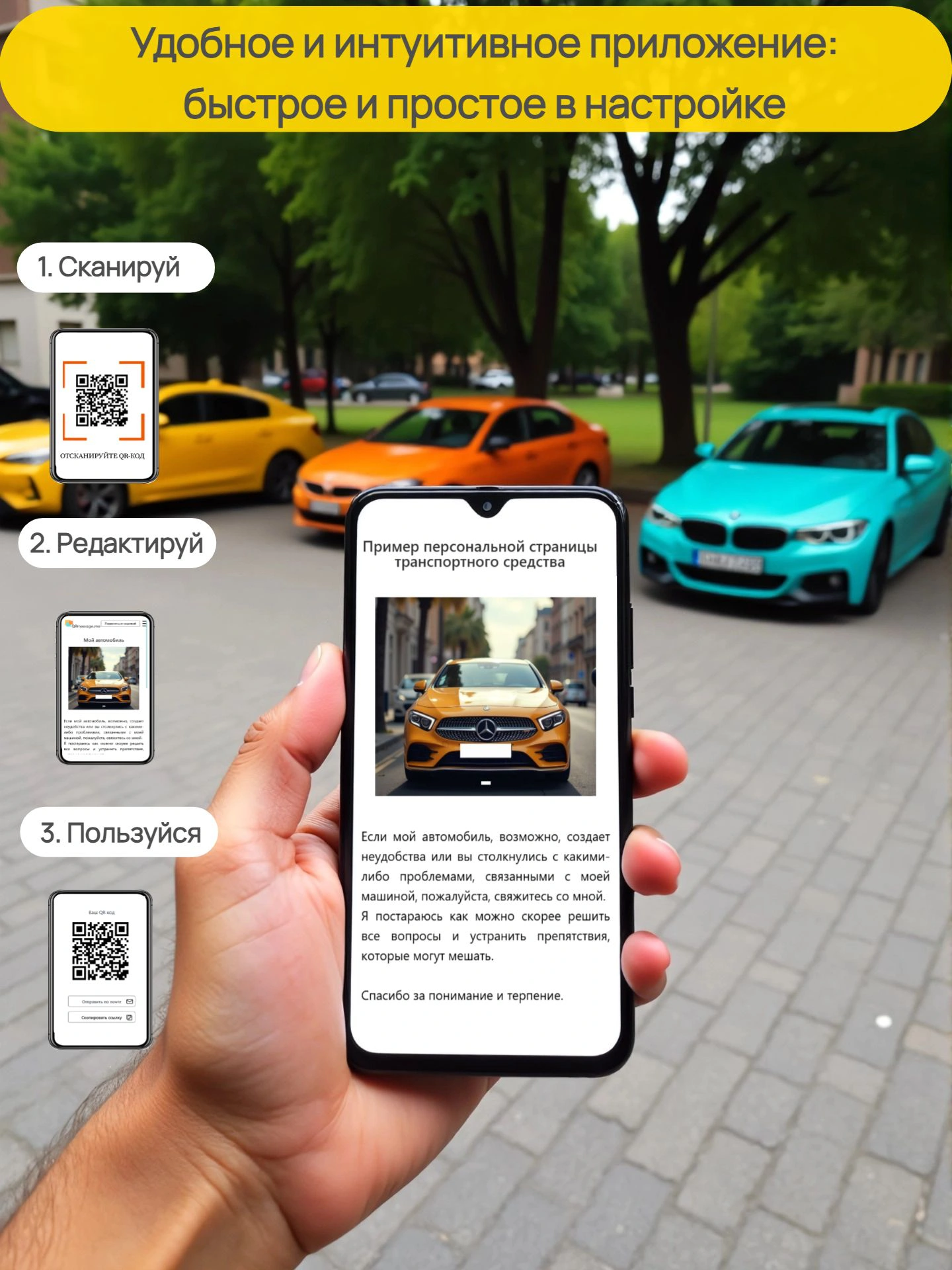 Автомобильная QR-наклейка — удобный способ для быстрого обмена контактами на дороге. Она крепится на лобовое стекло и позволяет другим водителям связаться с вами в случае необходимости, просто отсканировав QR-код и набрав указанный номер телефона.