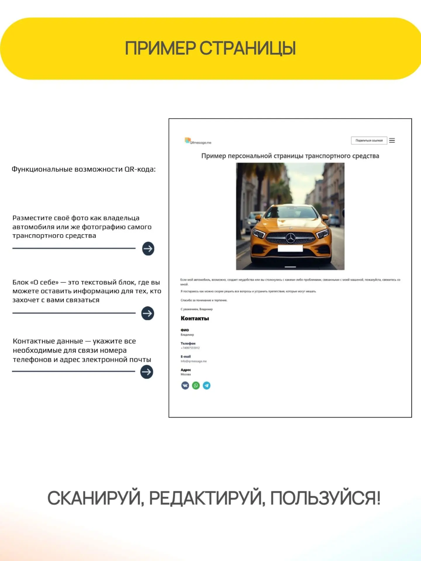 Функционал QR-кода для наклейки «Автомобиль» включает в себя несколько блоков: