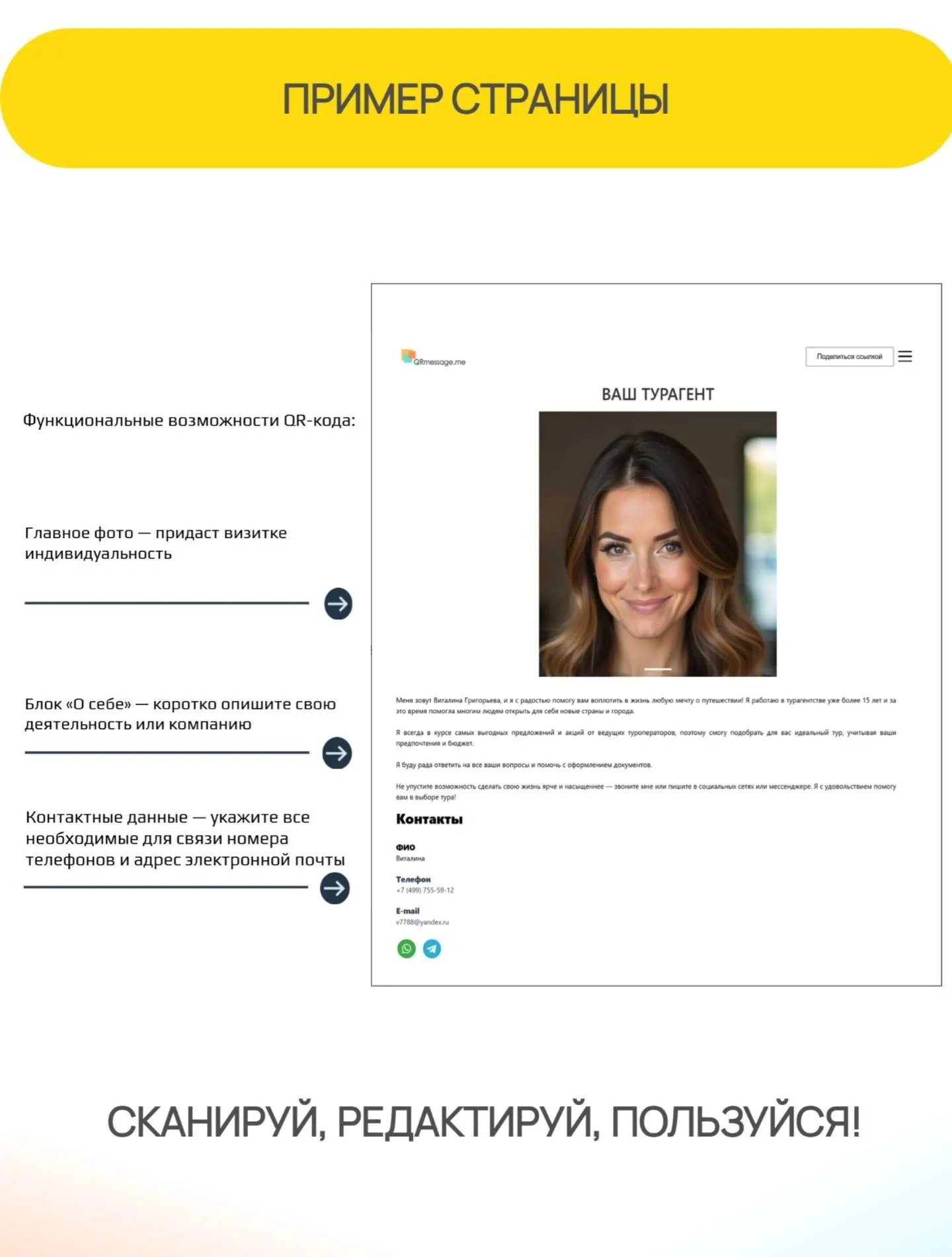 • Главное фото — придаст визитке индивидуальность.